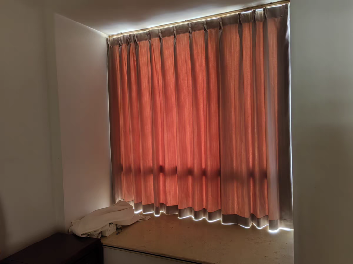 对于选电动窗帘的朋友来说,还有一个小困扰就是运行时帘布容易波浪紊乱、翘曲。中波帘在电机和滑车结构上做了优化,运行时能保持帘布波浪均匀统一,闭合时整体视觉也很平整,既保证了飘窗窗帘遮光效果,又兼顾了美观和使用体验。