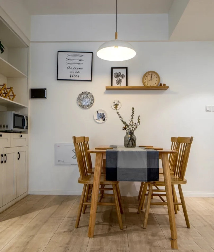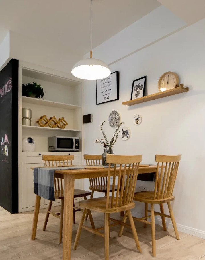餐桌旁边的墙面为了不太单调还做了一些小小的装饰,比如艺术品以及收纳架等,不仅好看而且还很实用。