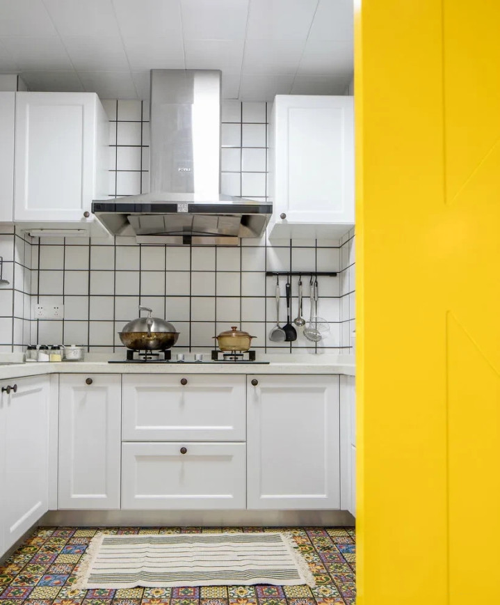 厨房,地面的花纹瓷砖装饰最有特色了,而且也是我特地挑选的,因为不想要厨房太过于单一,就连厨房门都设计成了仓谷门,就是为了让整体空间更好看更有特色。