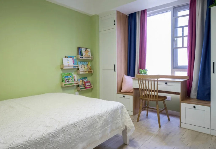 次卧,这是孩子的房间,采光是最重要的,其次就是收纳空间,充分利用了飘窗的空间定制了整个收纳柜,以及学习桌还有衣柜,窗户周围的空间都被利用起来,定制的好处就是这样,可以充分利用空间。