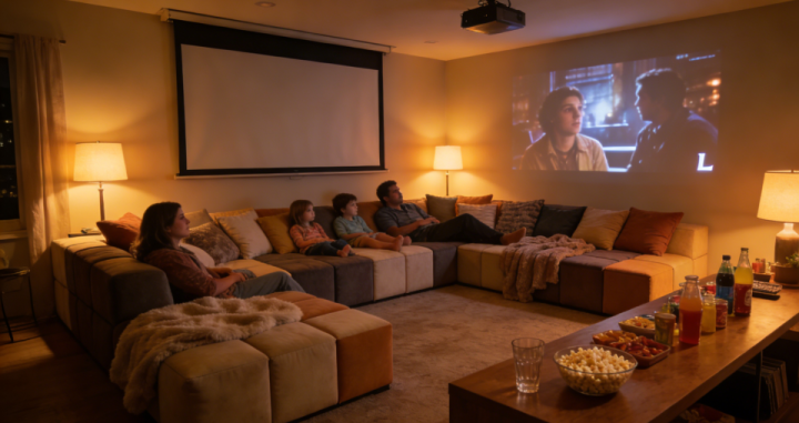 夜间模式(影院模式):沙发墩拼合,搭配柔软的地毯和靠枕,形成舒适的观影区。投影幕布从天花板降下,长桌可用于放置零食饮料。