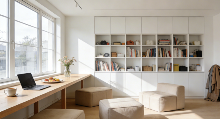 日间模式(居家办公/会客):一张大长桌靠窗摆放,既是餐桌,也是工作台。搭配可随意移动的模块化沙发墩,而非笨重的传统沙发。墙面做整面书柜+储物柜整合。