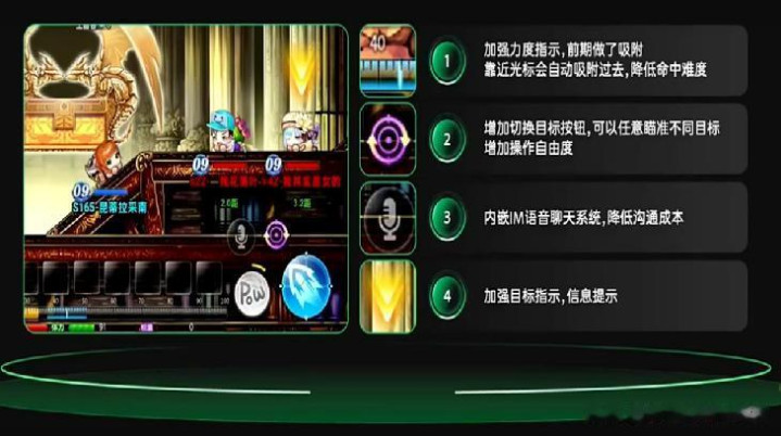 对于新用户来说,《弹弹堂》的核心战斗是一大难点,因为它涉及角度、力度和风速的计算。为此,我们在前期加入了“力度吸附”机制,当力度条接近指引位置时会自动吸附,帮助新手更容易命中;同时增加切换目标的按钮,提升战斗自由度。