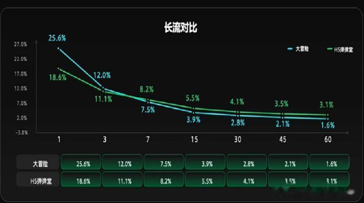 《弹弹堂》小游戏于去年8月上线,目前日均活跃用户突破10万,月流水超过5,000万。它是基于我们同款手游迭代开发的产品。不过,相比于流水和DAU,H5版的长线留存数据其实更亮眼——这是两个项目推广期的留存对比。通常来说,手游的用户忠诚度会高于小游戏,但《弹弹堂H5》的60日留存达到了3.1%,是手游版本的两倍。