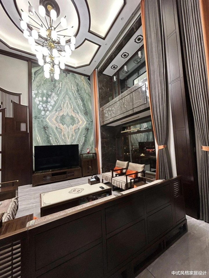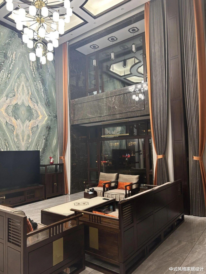挑高设计搭配几何纹样大理石背景墙,地面铺设浅灰色石材,光影层次丰富。深色实木框架沙发与茶几组合,线条沉稳,坐垫以橙色靠垫点缀;木质镂空屏风隔断,兼具通透感与私密性。深灰色窗帘垂落,水晶吊灯散发柔和光泽,与黑色电视墙形成对比,营造雅致内敛的东方意境。