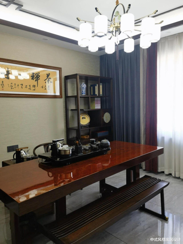 茶室整体雅致沉静,中央摆放深色实木茶桌,桌面光洁如镜,上置茶具一套,搭配同色系圈椅;桌旁设多层博古架,架上陈列青瓷茶具与圆形摆件。墙面悬挂书法挂画,笔墨间透着东方韵味,深色窗帘与浅色纱帘相映,顶部现代吊灯以简约造型平衡传统与现代。