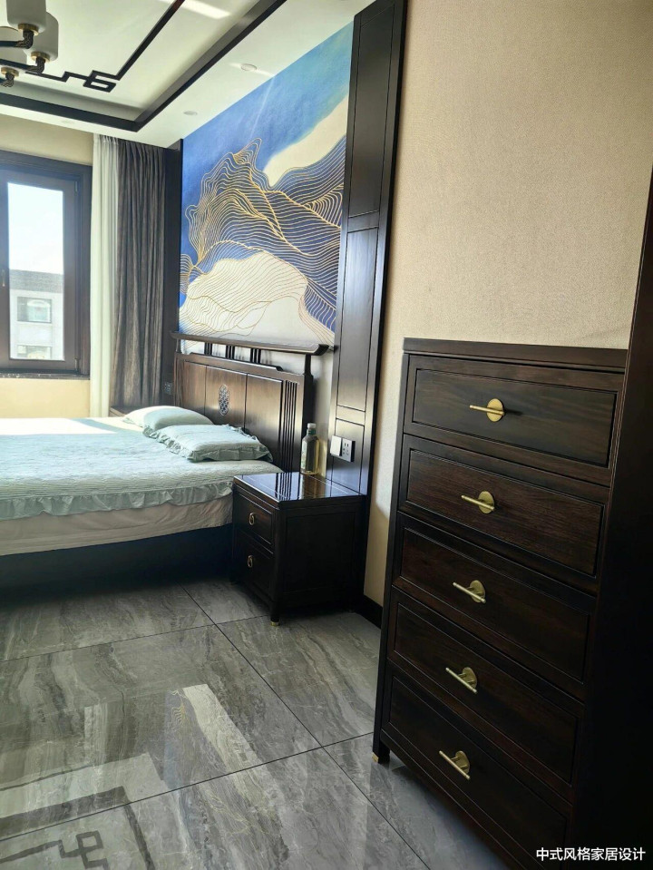 新中式风格卧室,整体沉稳雅致。中央为乌金木双人床,床头线条方正,搭配浅灰床品;床头背景墙悬挂蓝白渐变山水纹装饰画,金色线条勾勒山峦轮廓。床侧设深色实木床头柜,台面置简约台灯;右侧为多层抽屉柜,金属拉手增添精致感。地面铺灰色大理石纹理地砖,自然光透过窗户洒入,与深色木质家具形成对比,凸显空间层次。