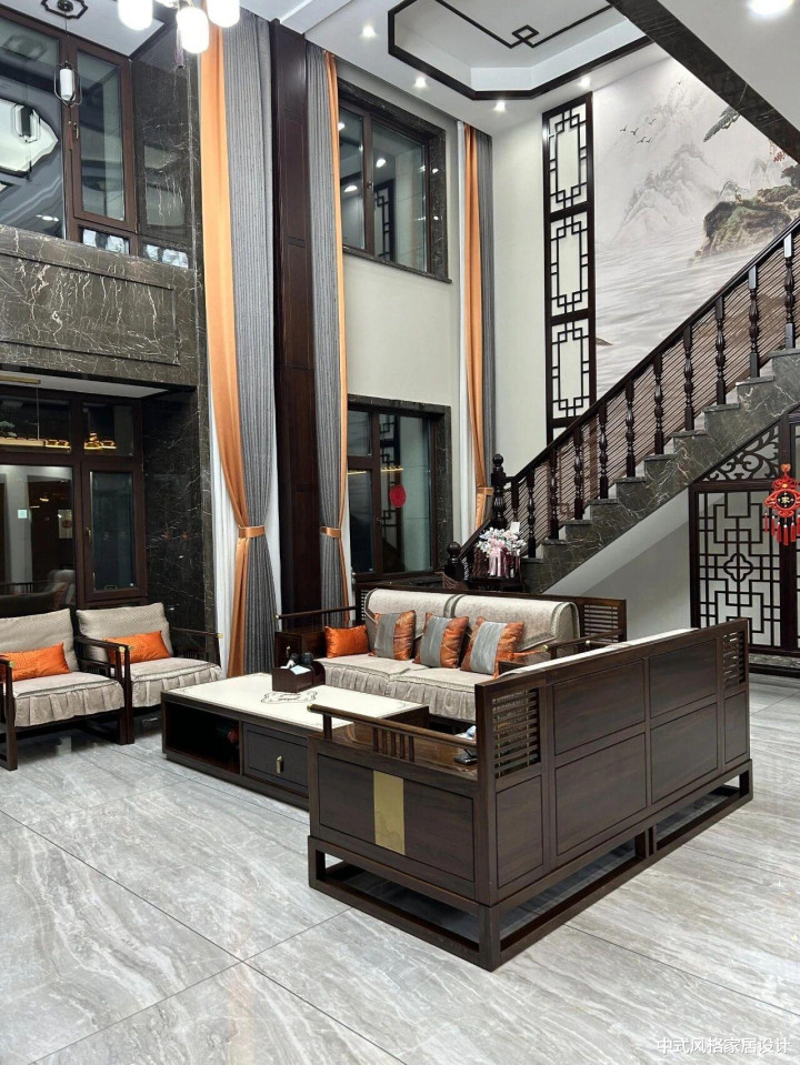 新中式客厅沙发组合,整体呈现东方美学与现代设计的融合。深色实木框架搭配浅色布艺坐垫,线条方正利落,扶手与靠背处有镂空雕花,细节处透着中式雅致。搭配同系列单人沙发与方形茶几,橙色靠枕点缀其间,增添温暖层次。背景中水墨山水画与木质楼梯相映,传统窗棂纹样与现代灯光交织,营造出兼具文化底蕴与时尚感的居家氛围。