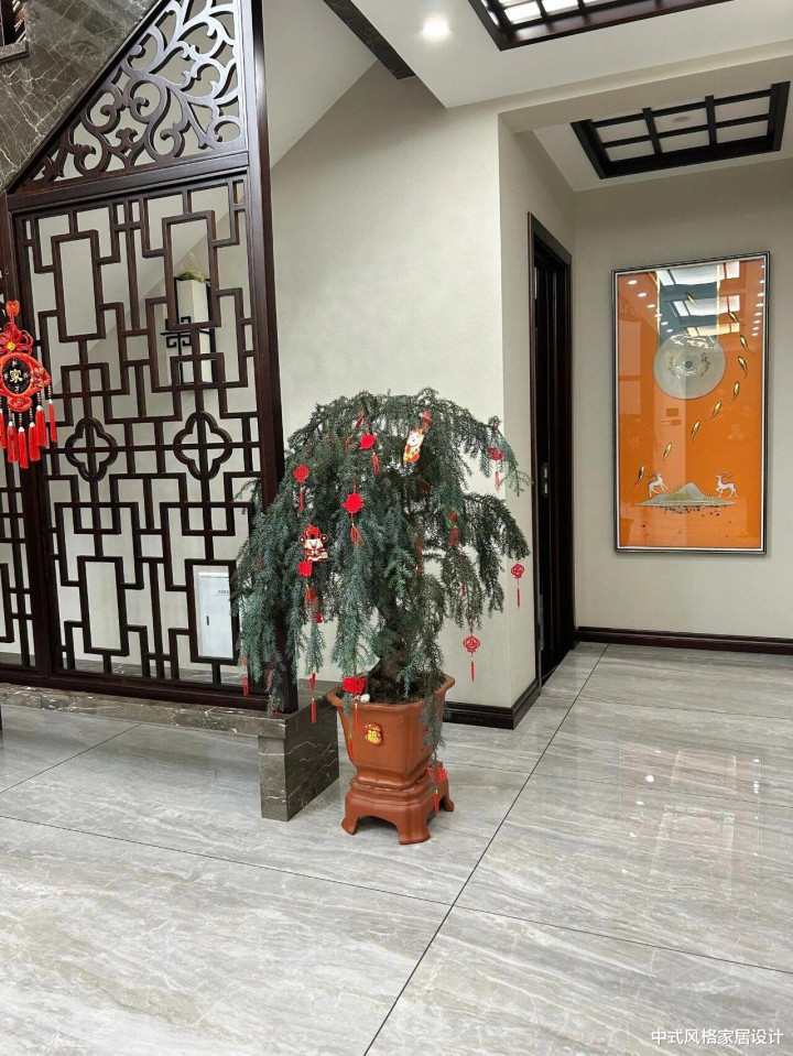 玄关,整体雅致温润。左侧为深色木质镂空雕花屏风,几何纹样与传统窗棂元素结合,后方悬挂红色中国结增添节日氛围。中央是一盆造型古朴的松树盆栽,枝干虬曲,点缀红色小灯笼,置于方形陶盆中,开云app官方在线入口尽显苍劲生机。右侧墙面悬挂橙色基调装饰画,抽象线条与圆形元素交织,与左侧屏风形成色彩对比。地面铺设浅灰色大理石地砖,线条简洁,整体空间在传统与现代的融合中透着岁月静好的质感。
