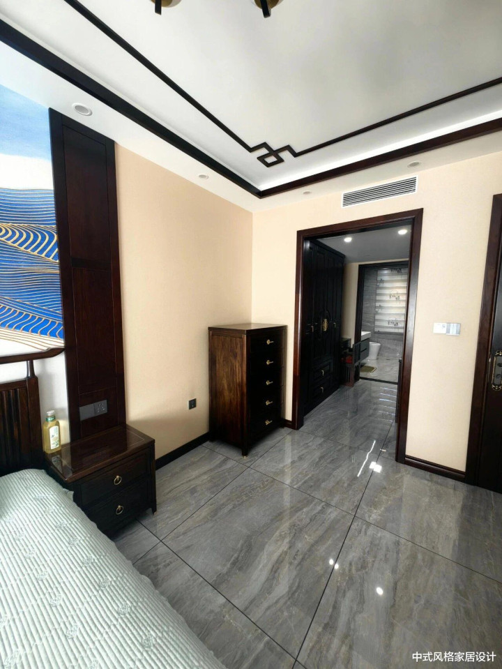 以米白墙面为基底,搭配深灰大理石地面,色调沉稳大气。地面通铺大规格灰色大理石,卧室配有衣帽间和卫生间。采用几何线条勾勒的简约吊顶,嵌入式灯带提供柔和照明。新中式大床、床头柜与衣柜均为深色乌金木材质,金属拉手点缀,线条利落,兼具实用功能与中式美学。