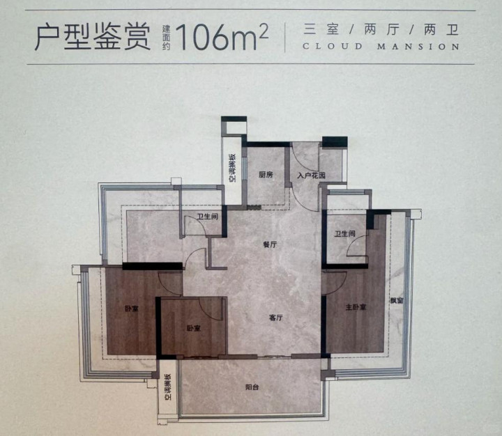 建面约106㎡三室两厅两卫户型,整体布局更舒展。餐客厅一体,公共区域开阔,活动空间充足。