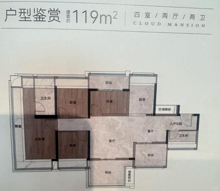 建面约119㎡四室两厅两卫户型,是典型的“一步到位”改善款,空间配置和实用性都很突出。