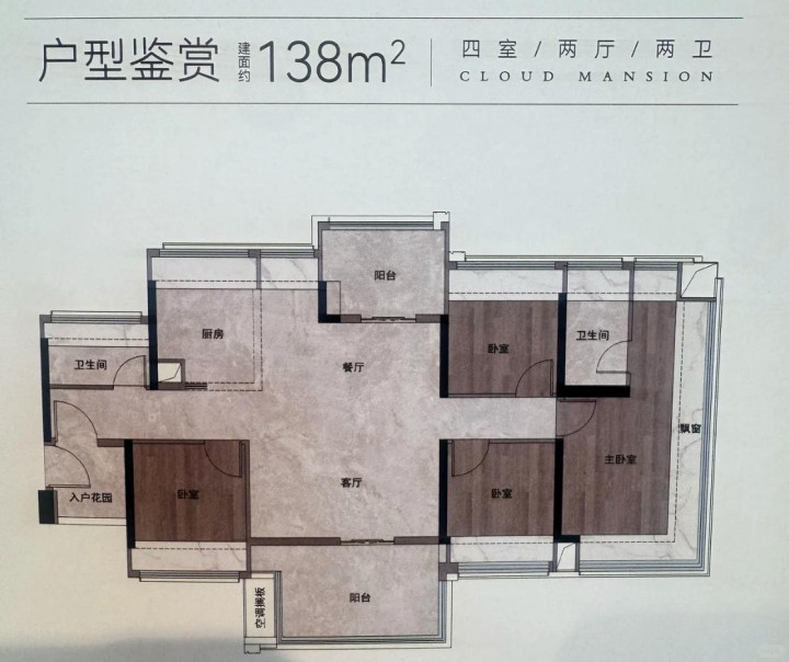 建面约138㎡四室两厅两卫户型,每个功能区(卧室、餐客厅、厨卫)的尺寸都比较舒展,没有紧凑感。