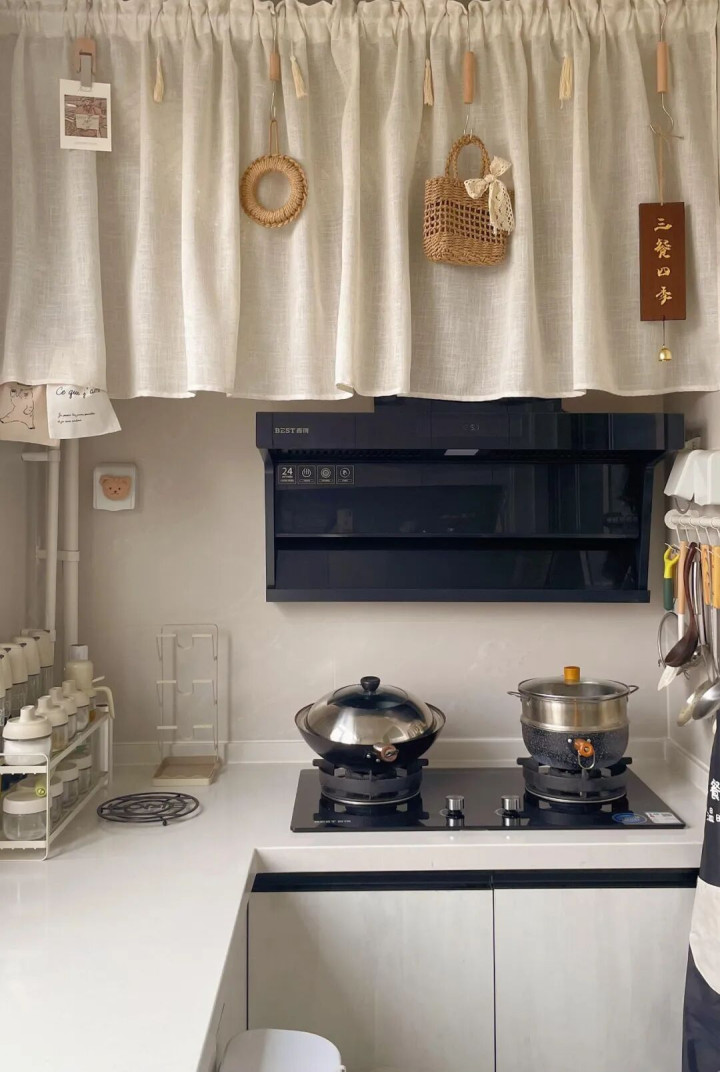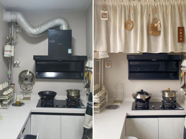 更省钱的油烟机遮丑法子,还有伸缩杆+防污帘子,几十块钱搞定,脏了直接扔洗衣机洗。
