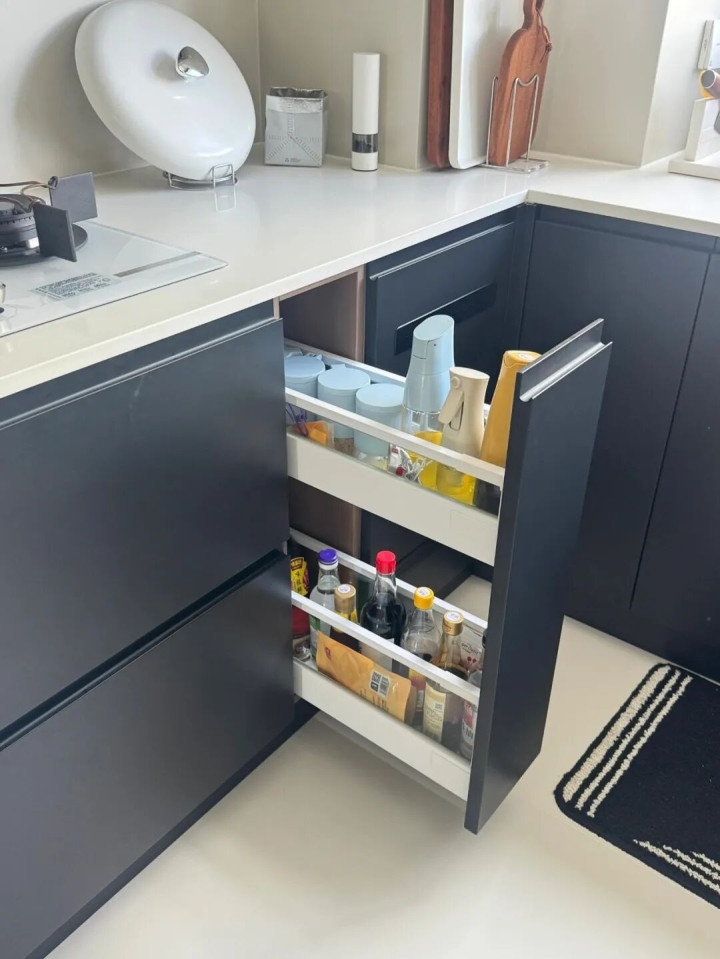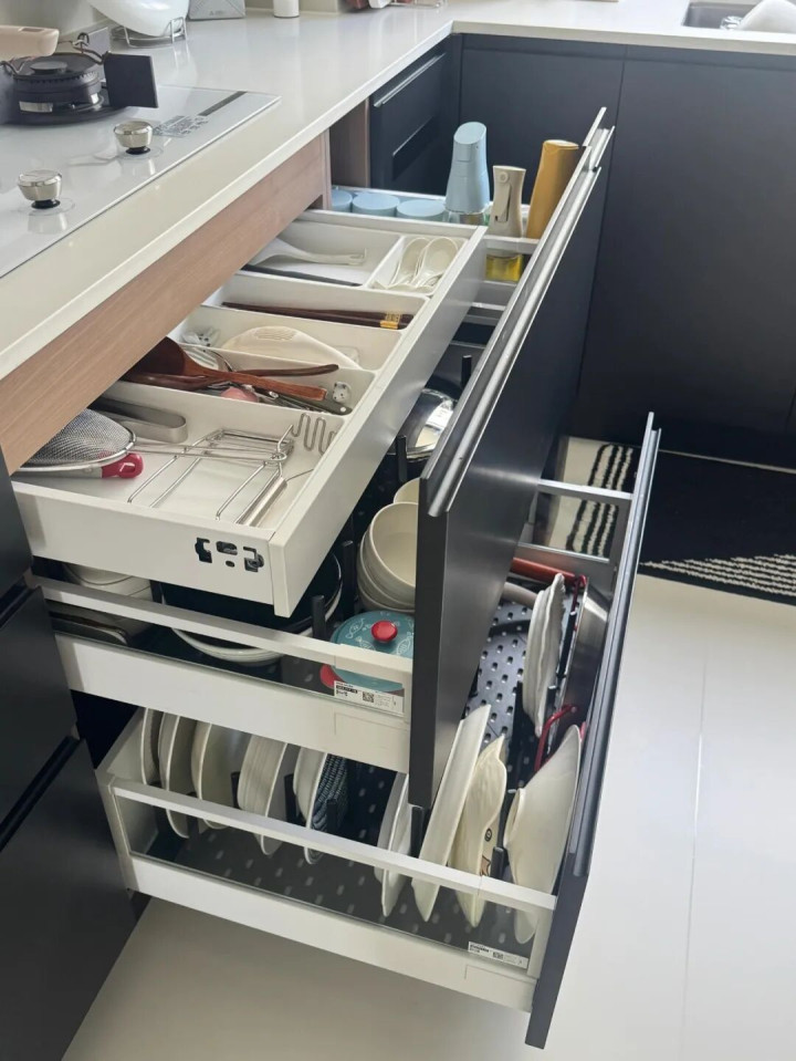 抽屉比层板柜好用太多,厨具抽屉+碗碟抽屉+锅具抽屉+调味拉篮,把柜子下面的空间安排的明明白白。