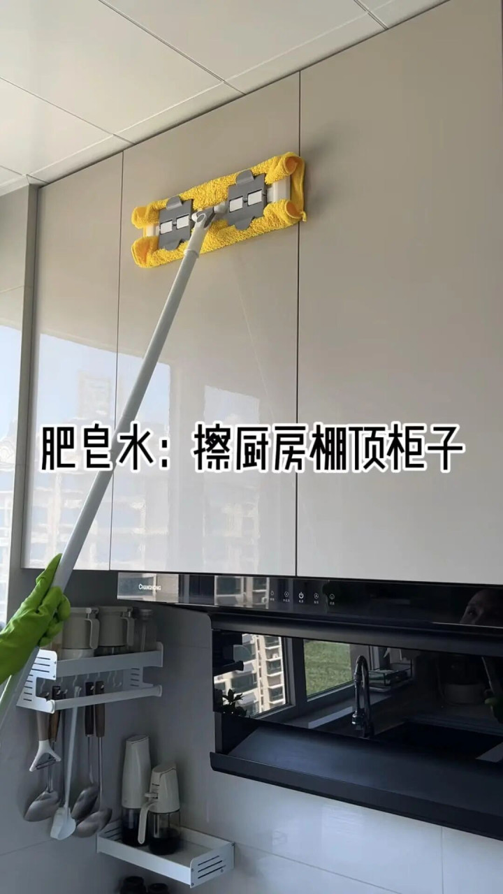 油烟机往上飘的油星子,全糊在柜门和柜顶。要想擦,又擦不干净,一两个月就逐渐包浆。