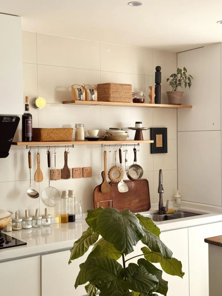 前阵子去邻居家蹭饭,发现她家的厨房没装吊柜,却收拾得整整齐齐,干干净净,整个厨房看着通透又宽敞,还很有烟火气,好羡慕。