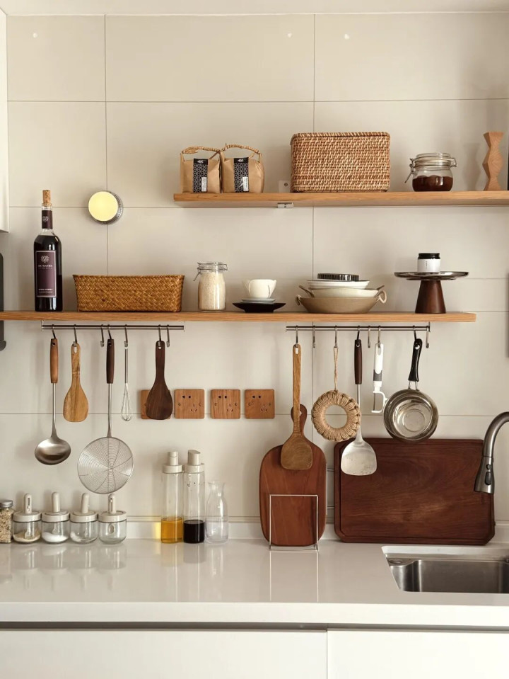 墙面买几块木板做置物架,调味料、常用杯具摆在实木隔板上,随手就能拿取。