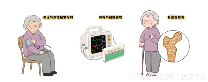 每年进行颈动脉超声、骨密度及认知功能评估,预防跌倒和脑功能下降。