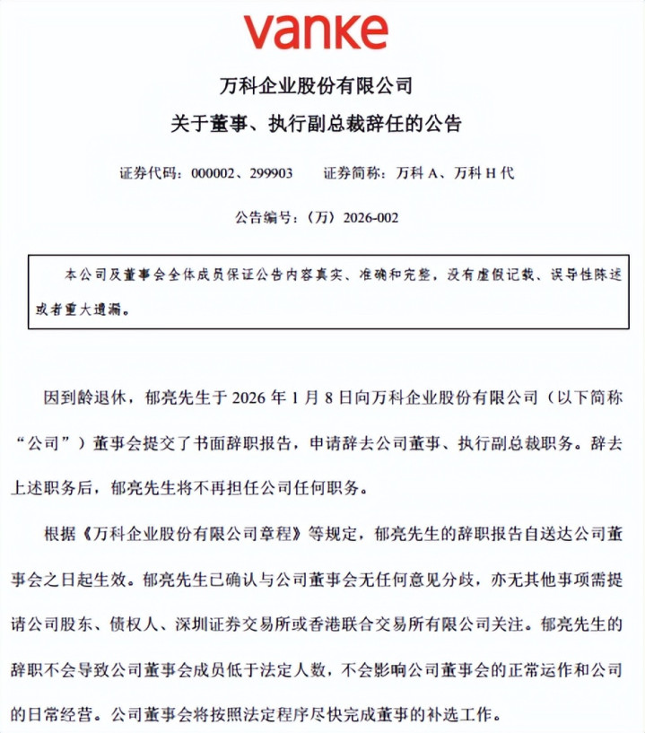2026年1月8日晚间,万科发布了一则看起来“极其标准”的公告:《关于董事、执行副总裁辞任的公告》。