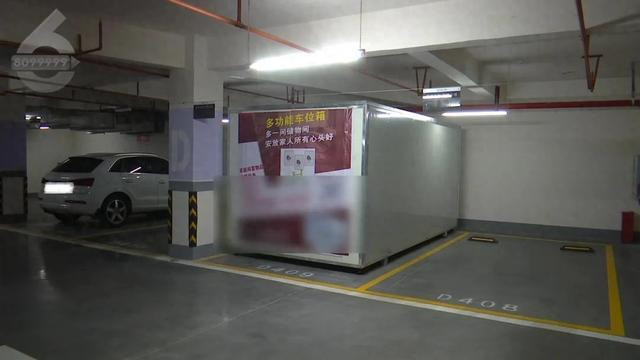 记者在地下车库共发现两个“集装箱”,其中一个写着“多功能车位箱,多一间储物间,安放家人心头好”的广告语。