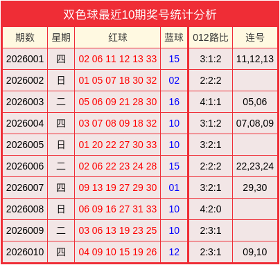 开奖回顾:双色球2026010开奖号码为04、09、10、15、19、26+12。其中012路比为2:3:1、开出1组连号09,10。