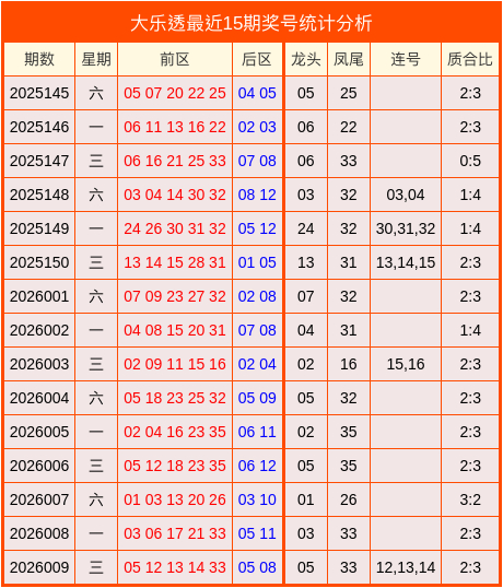 开奖回顾:大乐透第2026009期奖号:05、12、13、14、33+05、08。其中龙头为05,凤尾为33,质合比为2:3,开出2组连号12,13,14。