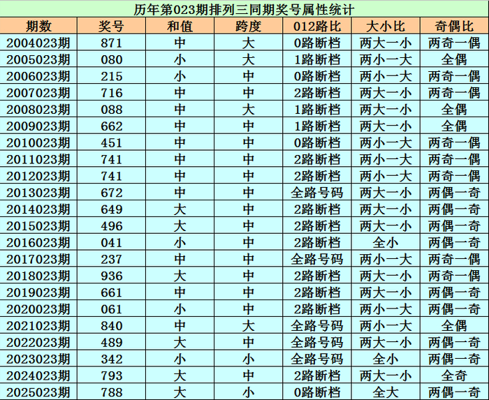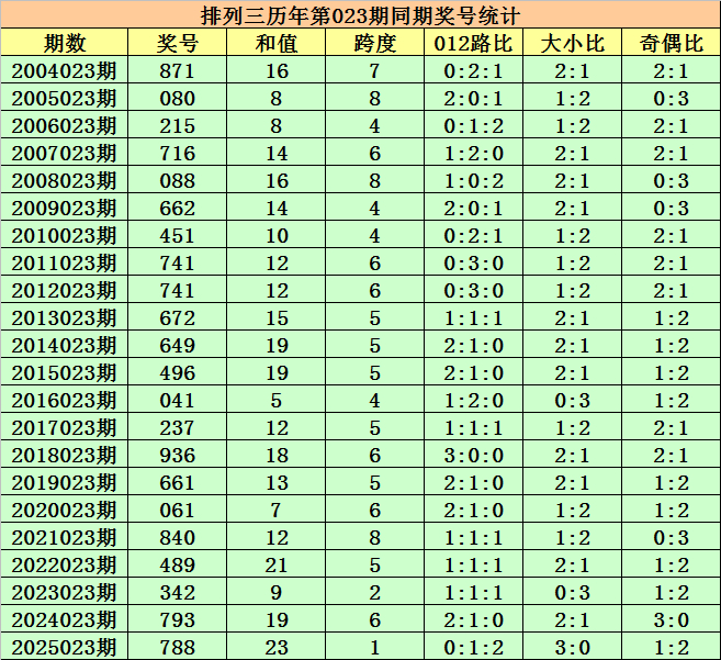 历史上第2026023期排列三已开出22期奖号了,历年同期奖号分别为:871、080、215、716、088、662、451、741、741、672、649、496、041、237、936、661、061、840、489、342、793、788,详细统计见下表: