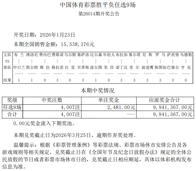 北京时间1月23日,胜负彩第26014期任九开奖结果揭晓。本期任九开出4007注,单注奖金2481元。本期任九总投注额为15,538,376元。