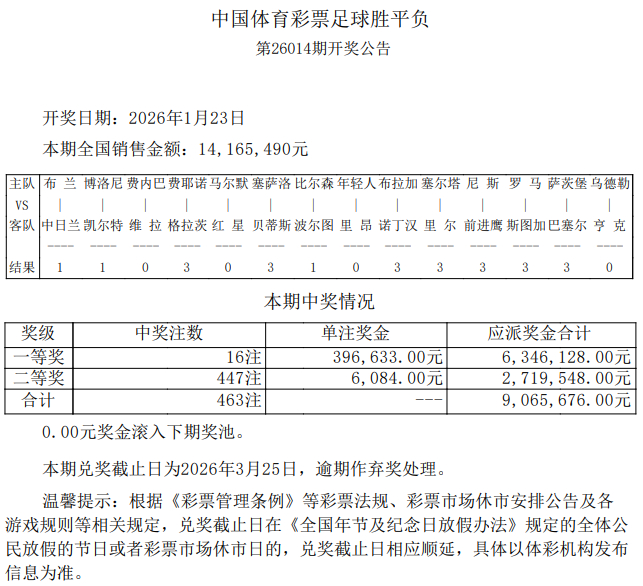 北京时间1月23日,胜负彩第26014期开奖结果揭晓。本期足彩头奖共开出16注,单注奖金396,633元;二等奖开出447注6084元;任九开4007注2481元。本期14场销量为14,165,490元,任九总投注额为15,538,376元。