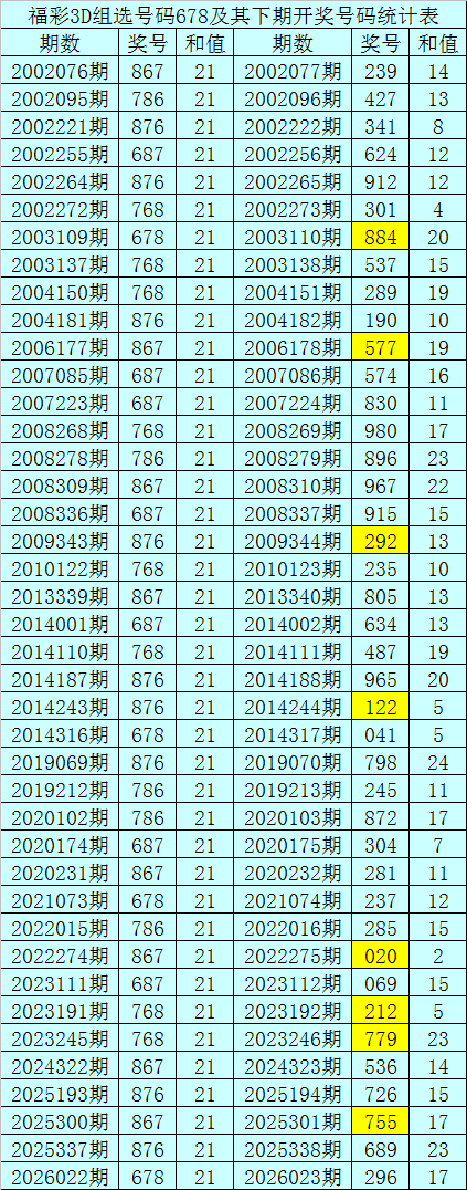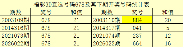 一、开奖回顾:第2026022期福彩3D奖号为678。奖号奇偶比为1:2,和值为:21,跨度为:2。