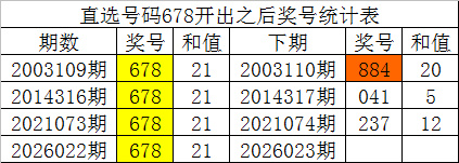 福彩3D第2026022期开出直选号码为:678,该直选号码历史上出现了4次,其下期分别开出了号码:884、041、237,如图:
