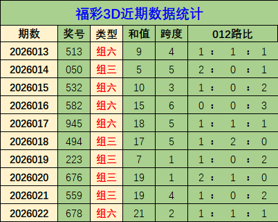 开奖回顾:福彩3D开奖号为678,其中奖号012路比为1:1:1,和值21,跨度为2。